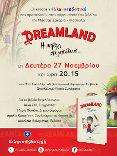 Οι εκδόσεις Ελληνοεκδοτική σάς προσκαλούν στην παρουσίαση του βιβλίου της Μάσσας Ζαχαρία - Φασούλα Dreamland - Η μεγάλη περιπέτεια τη Δευτέρα 27 Νοεμβρίου και ώρα 20.15 στo Multi Event City Loft (7ος όροφος), Καραγεώργη Σερβίας 4 (Στοά Καλλιγά) Πλατεία Συντάγματος.